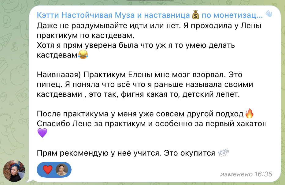 «Было особенно полезно узнать как проводить кастдевы, ставить цену на курс, чтобы она была адекватной»