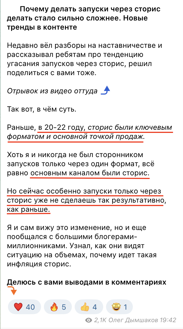 Я сейчас говорю о тех "экспертах", которые вводят в заблуждение аудиторию, убеждая: что запуски через сториз работают всё так же эффективно... Или что обладают каким-то волшебным способом сделать их рабочими